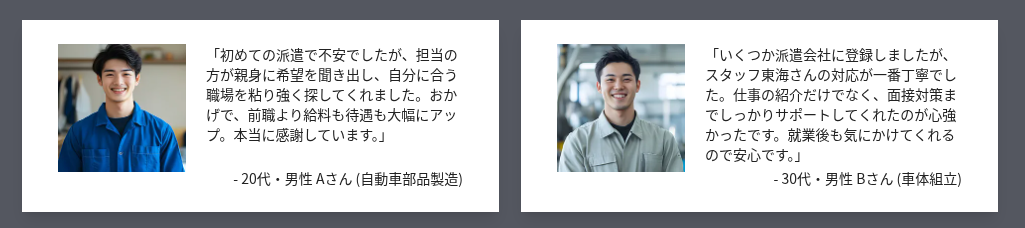 やりがいを感じる | 【仕事への責任と裁量】 正社員は、工程改善、後輩指導、品質管理など、より責任と裁量のある仕事を任され、強いやりがいにつながります。 |
