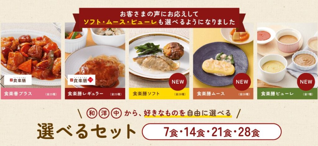 通常食(レギュラー)だけでなく、ソフト食、ムース食、ピューレ食まで対応。