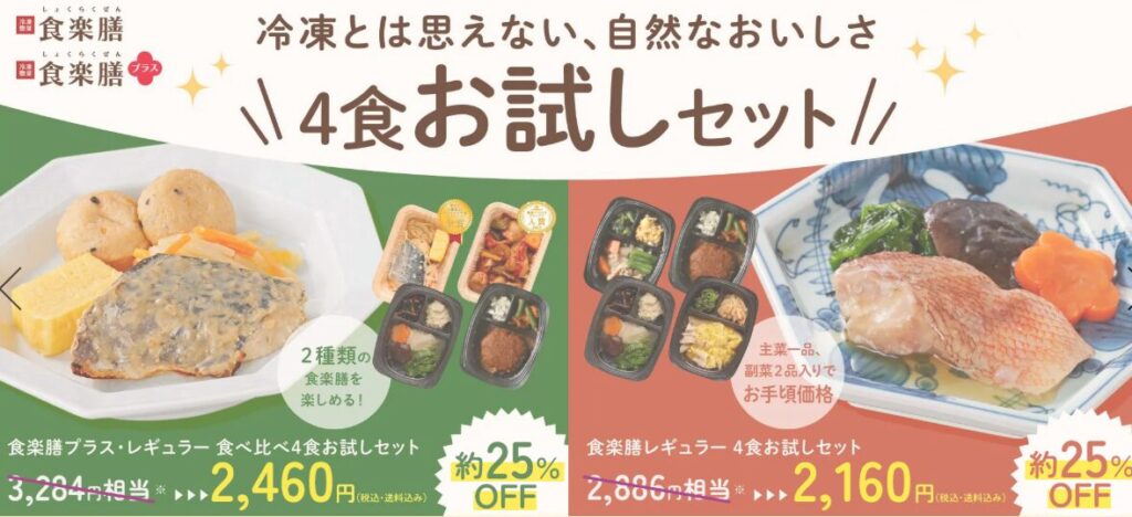 素材の色合いや香りを残しており、食欲をそそる工夫がされています。 - 食楽膳プラス:価格はセット数による